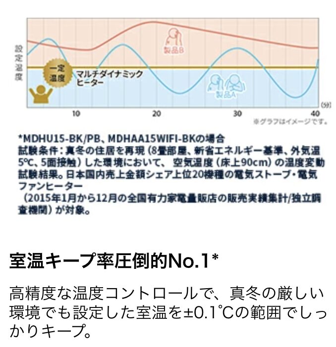 • マルチダイナミックヒーター:外気温5℃で室温20℃に達するまで約25分(デロンギ公式発表)。
